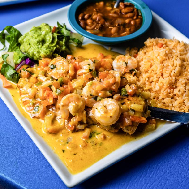 Tilapia fillet topped with shrimp sautéed in cheese sauce, served with rice, charro beans, guacamole, and warm tortillas.