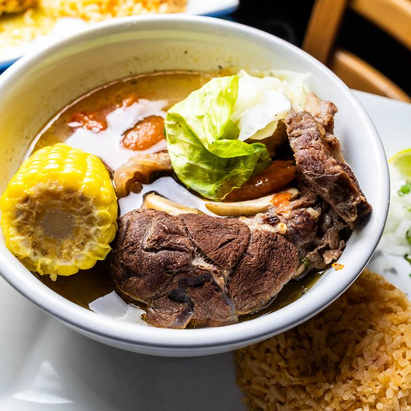 Beef and vegetable soup. Served with rice and tortillas.