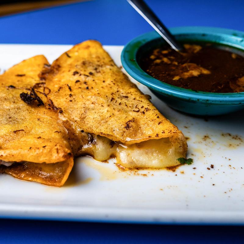 (3) Corn tortillas grilled taco-style with melted cheese and shredded beef cooked in a consume broth of dried chiles, herbs, and spices. Served with special sauce, cilantro and onions.