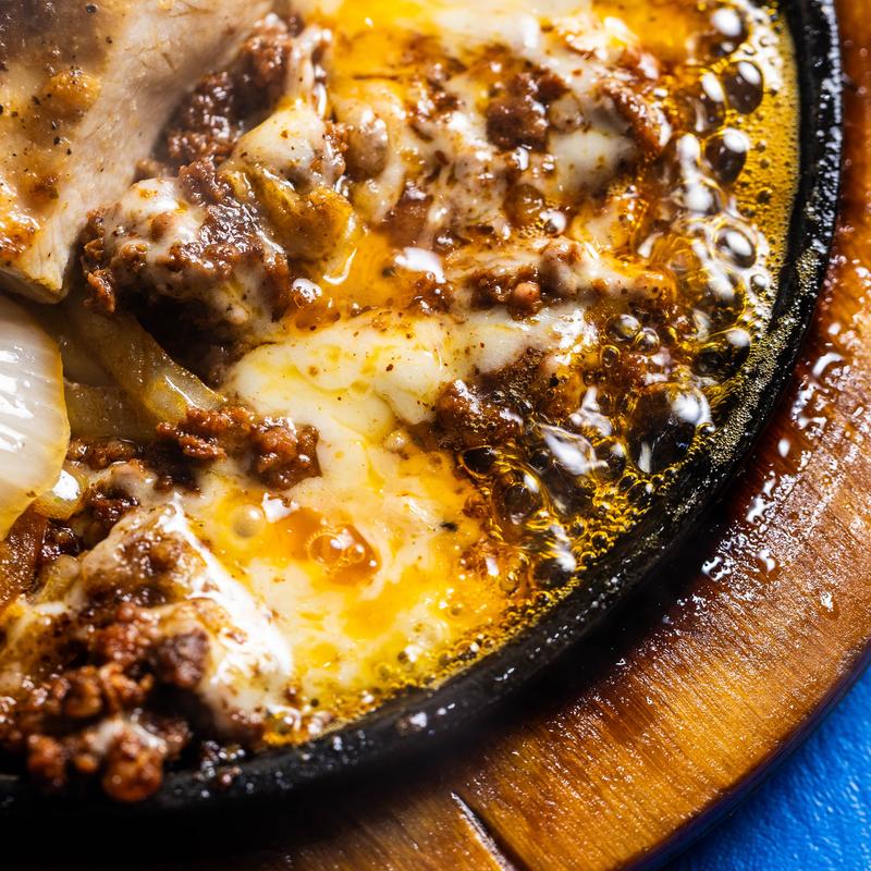A casserole dish full of delicious melted Monterey Jack cheese with beef or chicken al carbon.