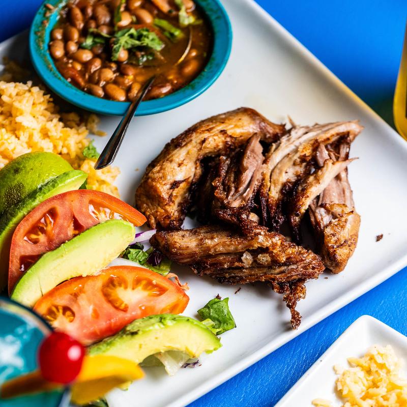 Tender pieces of deep-fried pork, served with avocado, lettuce, sliced onion, tomato, and tortillas.