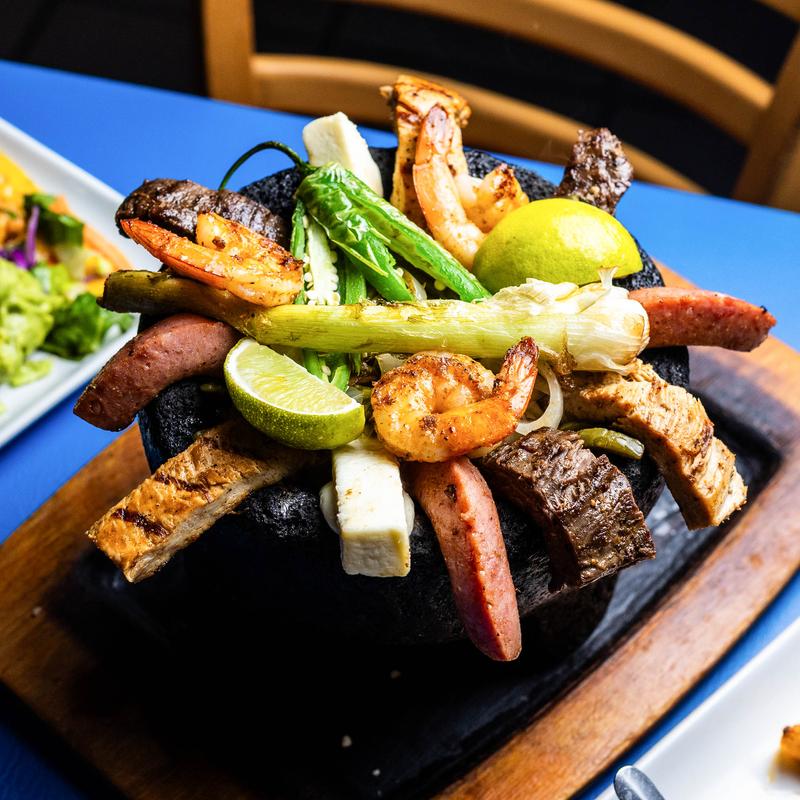 For one $20.99 | For two $37.99 • Molcajete stone with beef, chicken, carnitas, pork ribs, 1 cactus paddle, green onions, red sauce, and queso fresco.